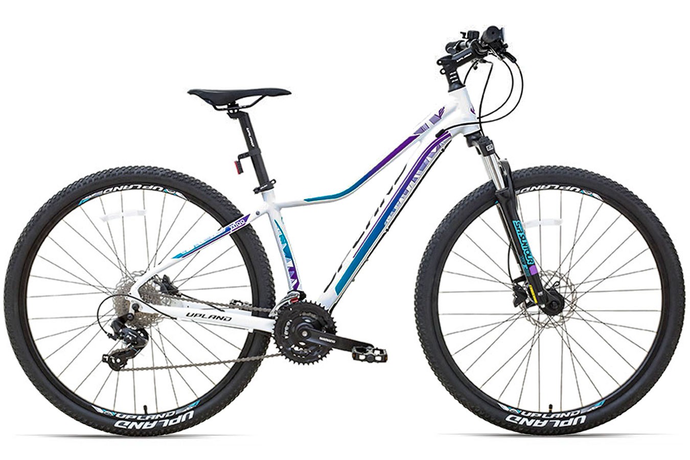 Bicicleta Upland X100 branco vem com componentes Shimano de 24 velocidades, freios hidráulicos Shimano, suspensão Suntour e quadro com cabeamento interno.