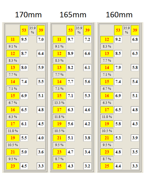 A outra opção que você tem a sua disposição é manipular o tamanho do seu cassete para acomodar a mudança de comprimento da pedivela. Começando mais uma vez do nosso padrão 170 mm 53/39, vamos ver quanto nós devemos mudar o cassete: