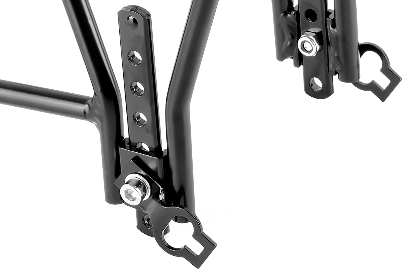 Bagageiro ajustável para alforge compatível com aro 26" à 29". Estrutura em alumínio reforçado, instalação rápida e fácil. Ideal para transportar até 25 Kg.