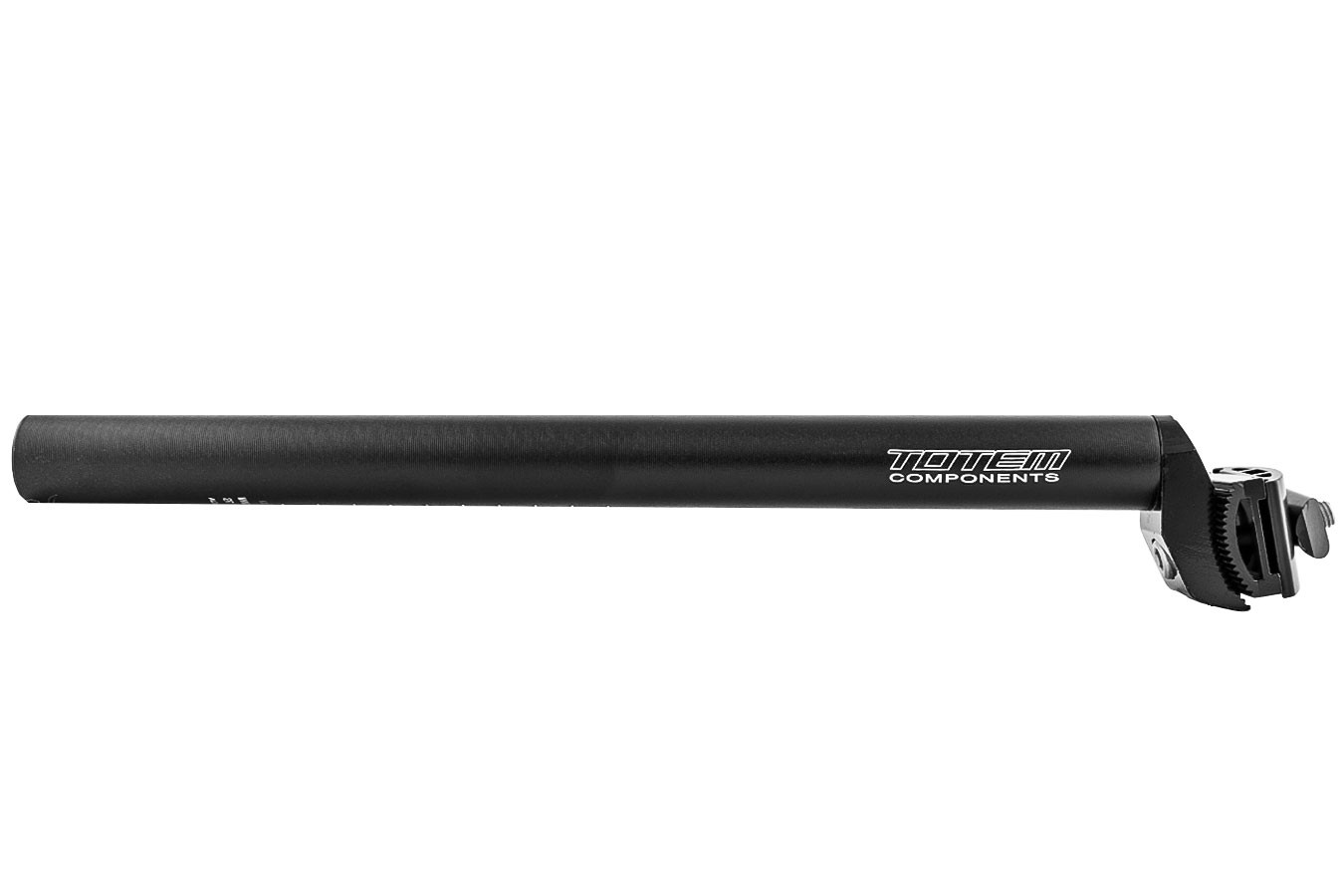 Canote de selim Totem 27,2 mm (diâmetro) x 350 mm (comprimento) em alumínio com pintura preta, com ótimo acabamento e carrinho fixador de trilhos acoplado.