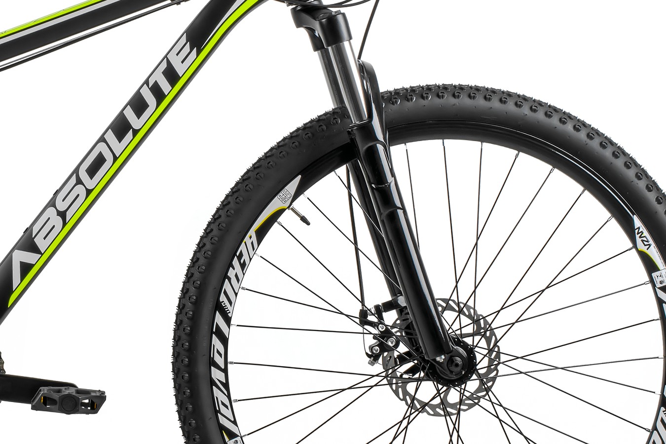 Bicicleta Absolute aro 29", com quadro em alumínio e câmbio traseiro Shimano. Freios a disco com aros parede dupla Disc 29''.