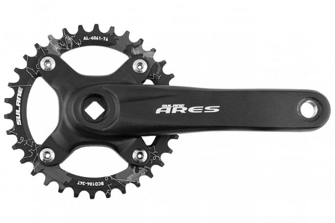 Pedivela Sulane com engrenagem Single com 34 dentes para sistemas de 1 x 12v. Modelo Ares, preto, em alumínio, com braços de 170 mm e centro ponta quadrada.